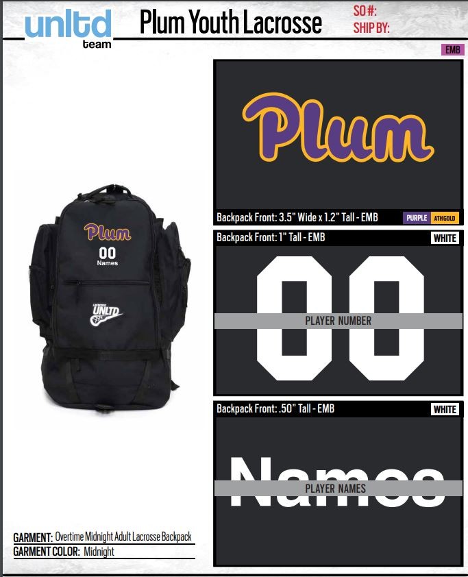 a year agoFor anyone interested in ordering a new Plum Lax Equipment Bag please follow the Link below. These Lacrosse Unlimited bags cost $85.00 each and come with your player's name and number stitched on them.